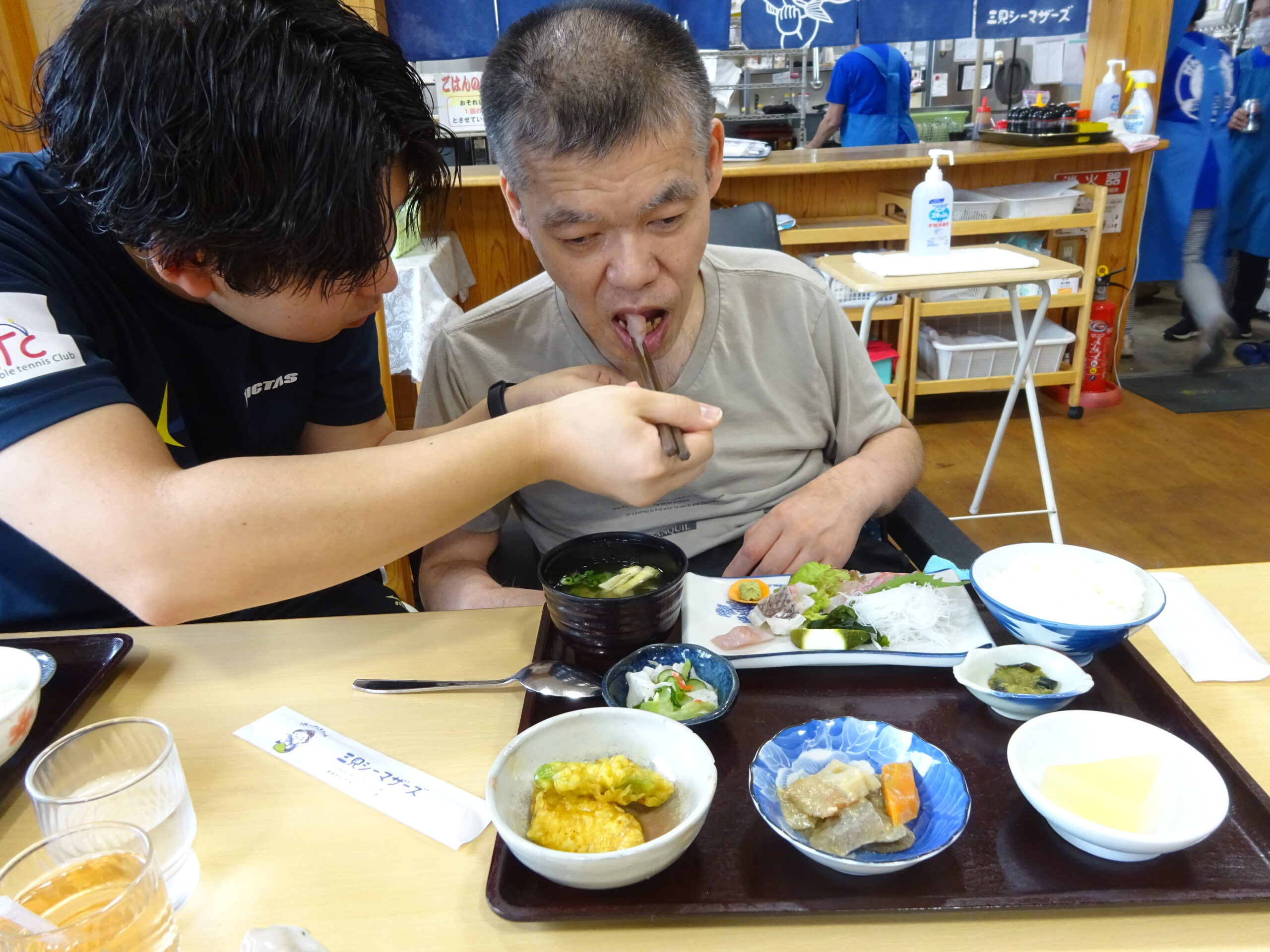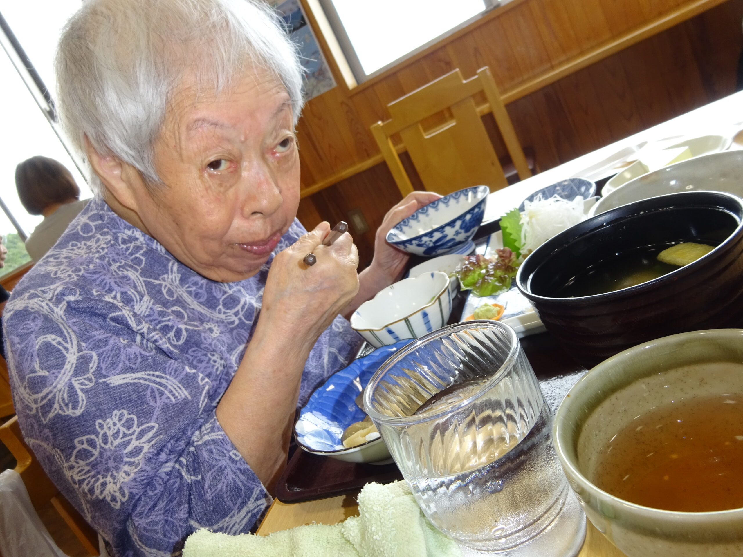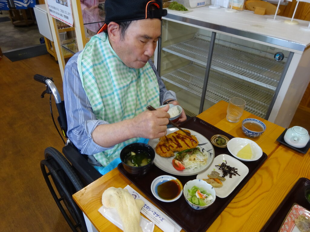 9月の1回目のお楽しみ外出では、萩のさんさん三見にある鯖島食堂へランチに行きました。お店はとても人気で、開店してすぐに満席になりました。美味しそうなメニューがたくさんありましたが、利用者さんは魚の定食やとんかつ定食を選びました。料理が目の前に出されると、日頃食べることができない新鮮なお刺身やとんかつを喜んで食べていました。とても美味しい料理を食べることができ、楽しい外出となりました☺